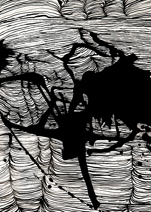 Dans cette toile emblématique, les jets d'encre fusionnent avec le travail méticuleux de la plume. Harmonie, agissant en véritable magicienne des temps modernes, manie l'encre avec dextérité. La plume, tel un prolongement de la main et de l'esprit, trace des lignes d'une finesse exquise qui confèrent une réelle complexité à la composition. De plus, chaque coulure raconte sa propre histoire sur la toile vierge, devenant un vaste terrain de jeu pour l'exploration visuelle. Chaque recoin de la feuille est un témoignage de l'interaction habile entre l'intention artistique et le hasard.